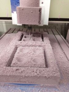 The overall mold geometry was programmed in CNC software, with the major portions machined from foam stock. A block measuring 2″ × 7″ × 13″ was placed in the CNC router.